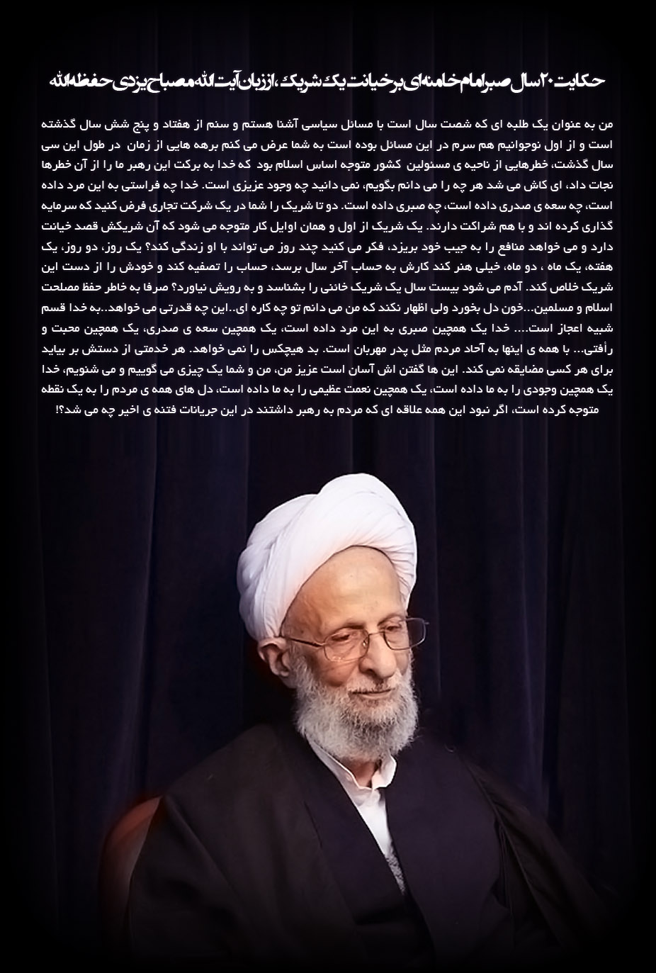 پوستر حکایت آیت الله مصباح از صبر اعجاز آمیز امام خامنه ای در تحمل یک شریک خائن + صوت
