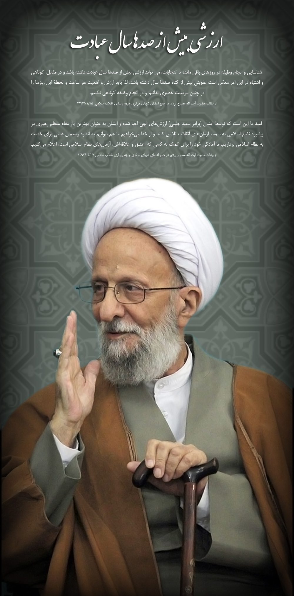 آیتالله مصباح یزدی : ما آمادگی خود را برای کمک به کسی که عشق و علاقهاش، آرمانهای نظام اسلامی است، اعلام میکنیم. امید است با عنایات حضرت ولی عصر(عجل الله تعالی فرجه الشریف) در این دوره قدمهای استواری در جهت حفظ ارزشهای نظام اسلامی برداشته شود.