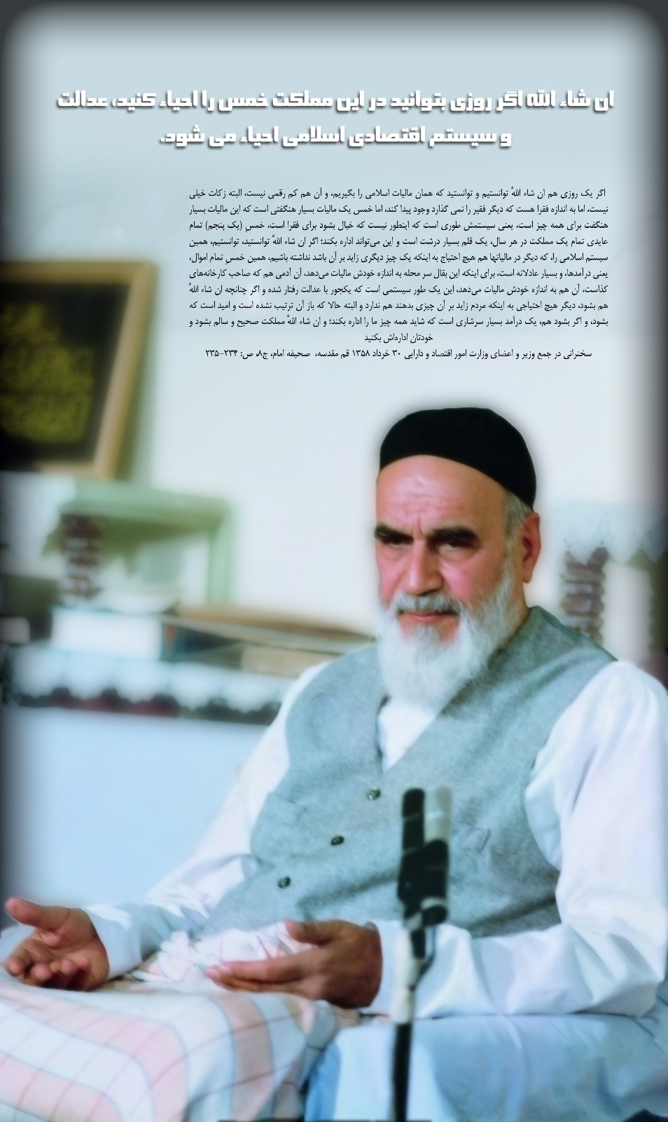 اگر یک روزى هم ان شاء اللَّه توانستیم و توانستید که همان مالیات اسلامى را بگیریم، و آن هم کم رقمى نیست، البته زکات خیلى نیست، اما به اندازه فقرا هست که دیگر فقیر را نمى گذارد وجود پیدا کند، اما خمس یک مالیات بسیار هنگفتى است که این مالیات بسیار هنگفت براى همه چیز است، یعنى سیستمش طورى است که اینطور نیست که خیال بشود براى فقرا است، خمس تمام عایدى تمام یک مملکت در هر سال، یک قلم بسیار درشت است و این مىتواند اداره بکند؛ اگر ان شاء اللَّه توانستید، توانستیم، همین سیستم اسلامى را، که دیگر در مالیاتها هم هیچ احتیاج به اینکه یک چیز دیگرى زاید بر آن باشد نداشته باشیم، همین خمسِ تمام اموال، یعنى درآمدها، و بسیار عادلانه است، براى اینکه این بقال سر محله به اندازه خودش مالیات مىدهد، آن آدمى هم که صاحب کارخانههاى کذاست، آن هم به اندازه خودش مالیات مىدهد، این یک طور سیستمى است که یکجور با عدالت رفتار شده و اگر چنانچه ان شاء اللَّه هم بشود، دیگر هیچ احتیاجى به اینکه مردم زاید بر آن چیزى بدهند هم ندارد و البته حالا که باز آن ترتیب نشده است و امید است که بشود، و اگر بشود هم، یک درآمد بسیار سرشارى است که شاید همه چیز ما را اداره بکند؛ و ان شاء اللَّه مملکت صحیح و سالم بشود و خودتان اداره اش بکنید ..